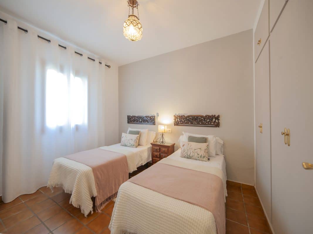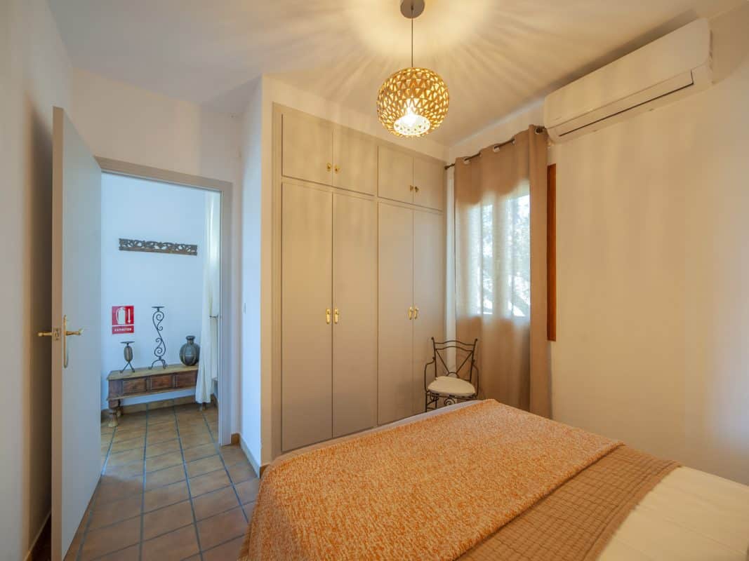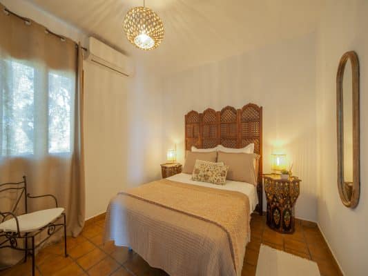 Kumara está adaptada para personas con movilidad reducida. Se encuentra ubicada al borde del pueblo, a mitad de una colina con vistas espectaculares del río Guadiana y Portugal. Decorada al estilo Hindú, dispone de una habitación con cama de matrimonio de 135cm y otra con dos camas de 90 cm, salón -cocina con chimenea de leña y baño. Distribuida en una sola planta. Climatizada en salón y habitaciones. Equipada con vitrocerámica de 2 fuegos, frigorífico bajo encimera, microondas, lavadora, menaje, televisión de pantalla plana, equipo de música, además de terraza orientada hacia el río y muebles de jardín.